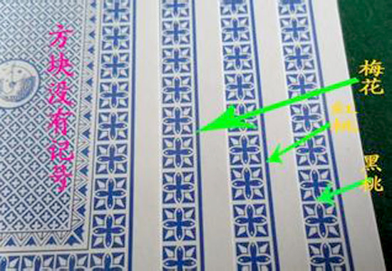 原来密码扑克的反面是由一些非常有规律的四方形排列起来的,在四个方向的角落各有一些规则的小四方形,而且它组成的形状跟正面牌的点数是一样的,这样的话很容易就看出来了,这只是其中一种识别方法,有的牌就有点难度了,不过只要看的多了一眼还是能够看出来的。