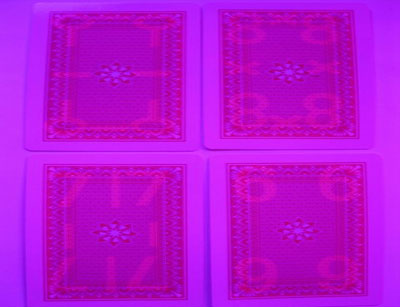 宾王838白光扑克外观和普通扑克一样,就是扑克牌的背面用特殊的白药水做上去,那药水是用激光机注进去的。用肉眼无法识别,但配带上透视眼镜后,就可以借助于不同波长的荧光灯,类似验钞机的原理,可以看到涂在扑克背面肉眼看不到的隐形字。